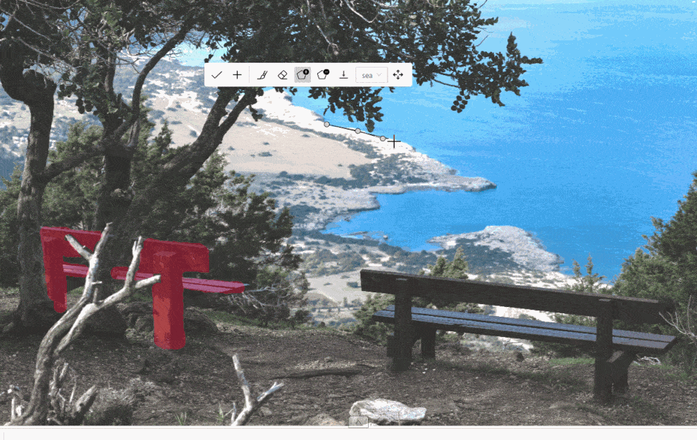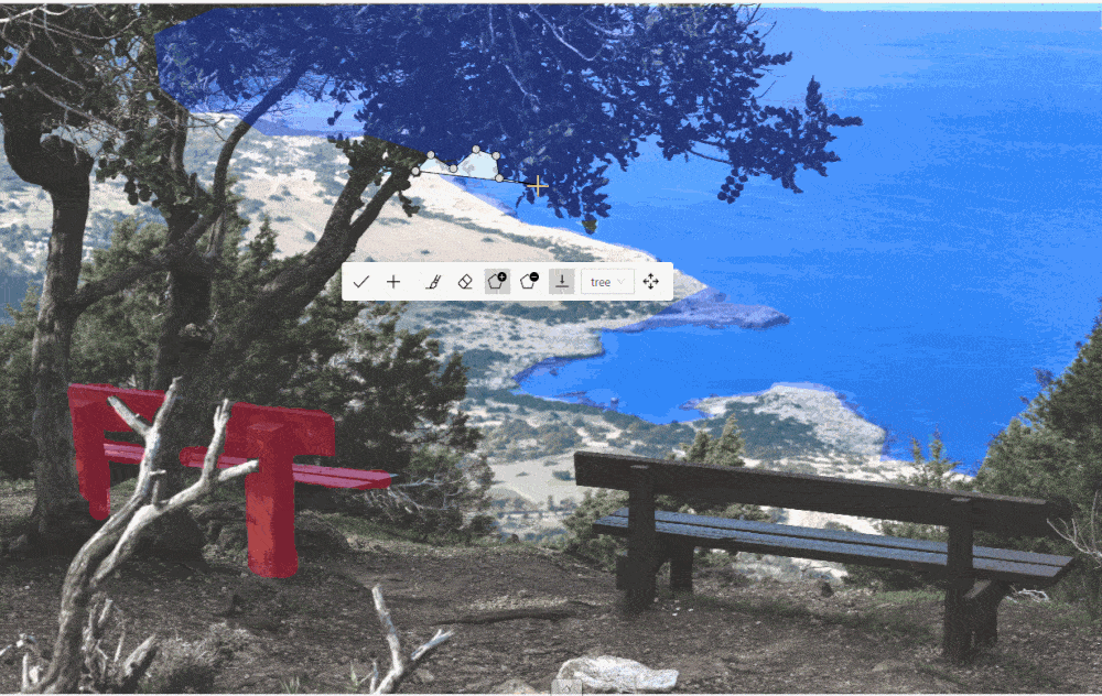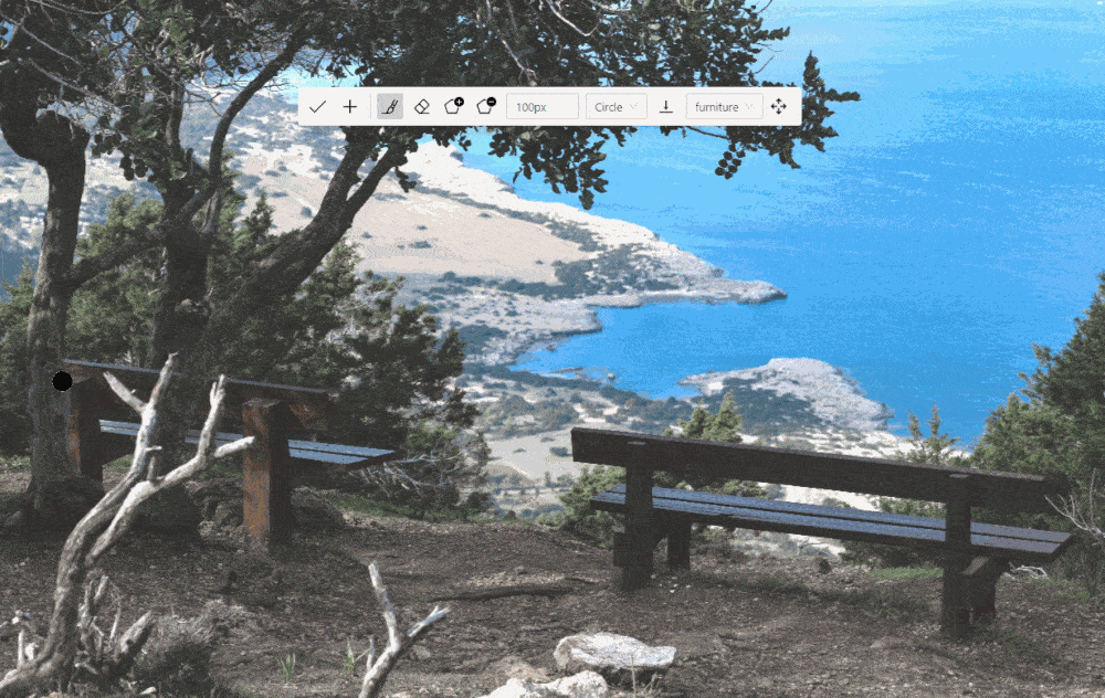 With a brush tool, you can create masks for disjoint objects, that have multiple parts, such as a house hiding behind trees, a car behind a pedestrian, or a pillar behind a traffic sign. The brush tool has several modes, for example: erase pixels, change brush shapes, and polygon-to-mask mode.