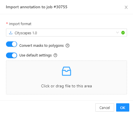 Import follows the general import dataset procedure, with the additional option of converting masks to polygons.