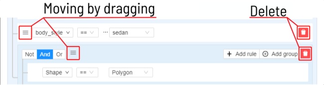 To remove the rule or group, click on the Delete button.