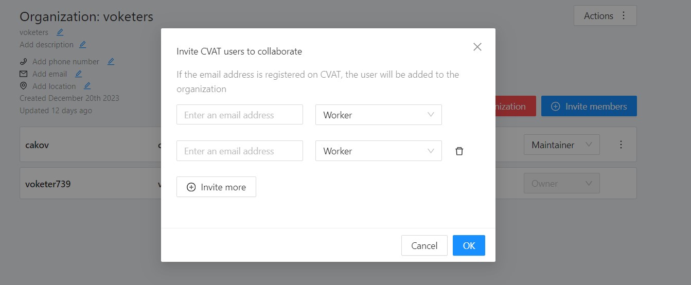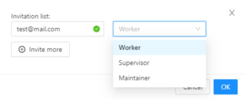 | Role drop-down list | Defines the role of the user which sets the level of access within the Organization: <br /><li />Worker: Has access only to the tasks, projects, and jobs assigned to them. <li />Supervisor: Can create and assign jobs, tasks, and projects to the Organization members. <li />Maintainer: Has the same capabilities as the Supervisor, but with additional visibility over all tasks and projects created by other members, complete access to Cloud Storages, and the ability to modify members and their roles. <li />Owner: role assigned to the creator of the organization by default. Has maximum capabilities and cannot be changed or assigned to the other user. |