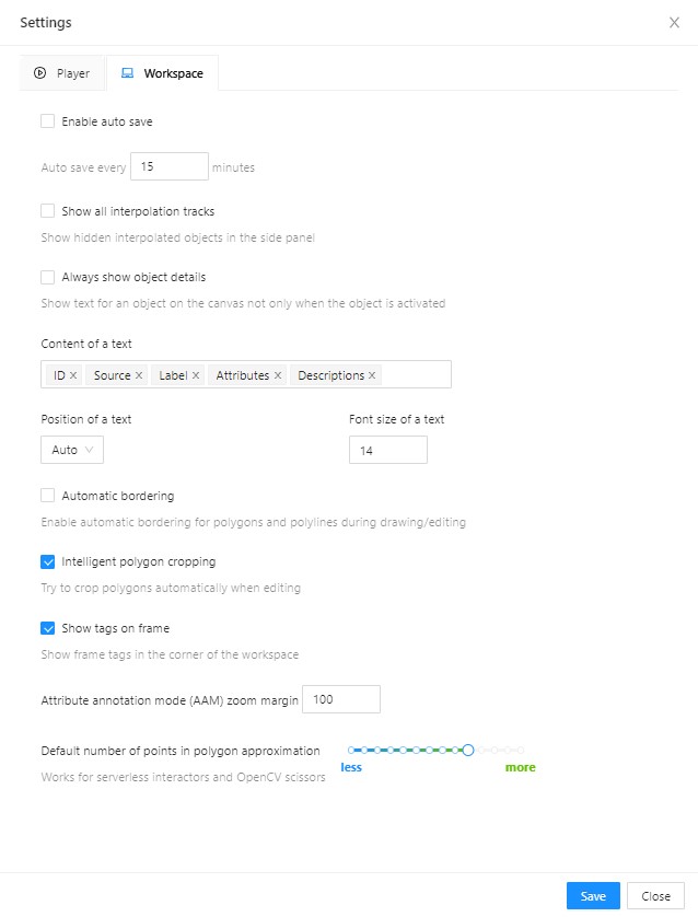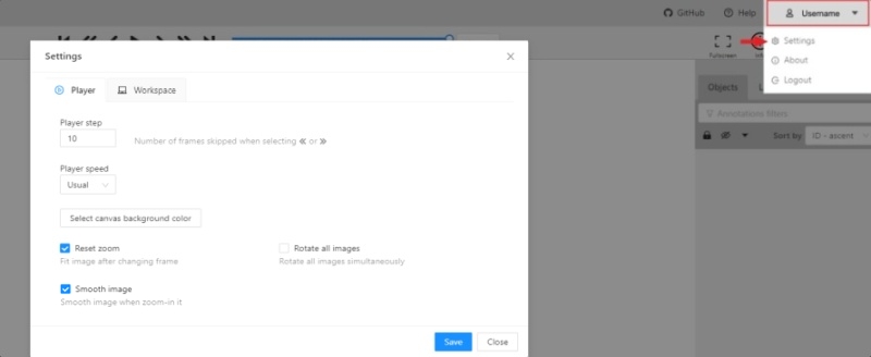 Saveto save settings (settings will be saved on the server and will not change after the page is refreshed). ClickCancelor pressF2to return to the annotation.